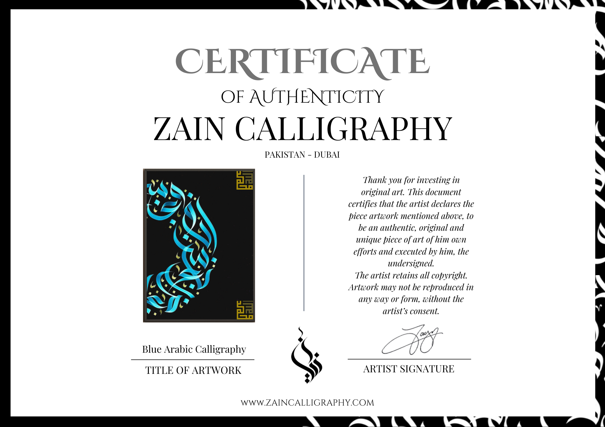 Each piece comes with an Official Certificate of Authenticity, ensuring it is a genuine Zain Calligraphy creation.
